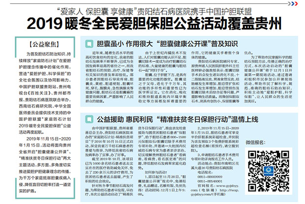 2019年11月15日-2020年1月15日,活動將面向貴州全省開啟“膽囊健康公開課”主題活動,多方面、多角度切實推進愛膽護膽健康理念的傳播,為千萬個家庭抵御膽囊疾病入侵、降低盲目切膽率打造一道堅實的護盾。